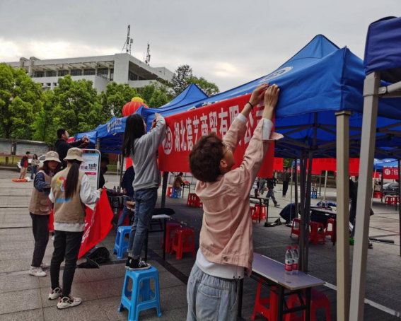 集团上下高度重视此次招聘会。早八点前,各院系就创部成员已在图书馆正门集合完毕,相关负责老师带领大家布置现场。