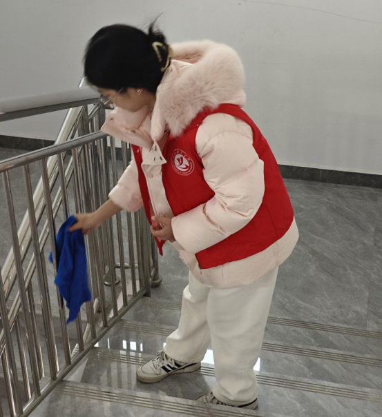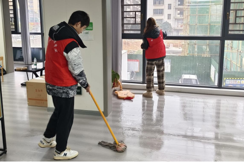 (志愿者们正在进行拖地与擦玻璃的工作)