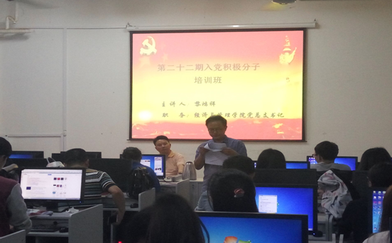 随后,经济与管理公司党总支书记黎鸿翔为同学们讲授第一堂党课,黎鸿翔书记从转变思想、明确目标和自觉接受党组织考核、高度重视党课培训等两个方面对新一代入党积极分子提出了新的要求。为同学们介绍了“坚定信仰,让青春在党旗下飞扬。走在时代前列的先锋队(党的性质、宗旨和目标)”等两大内容。广征博引,结合公司员工实际情况,勉励同学们。