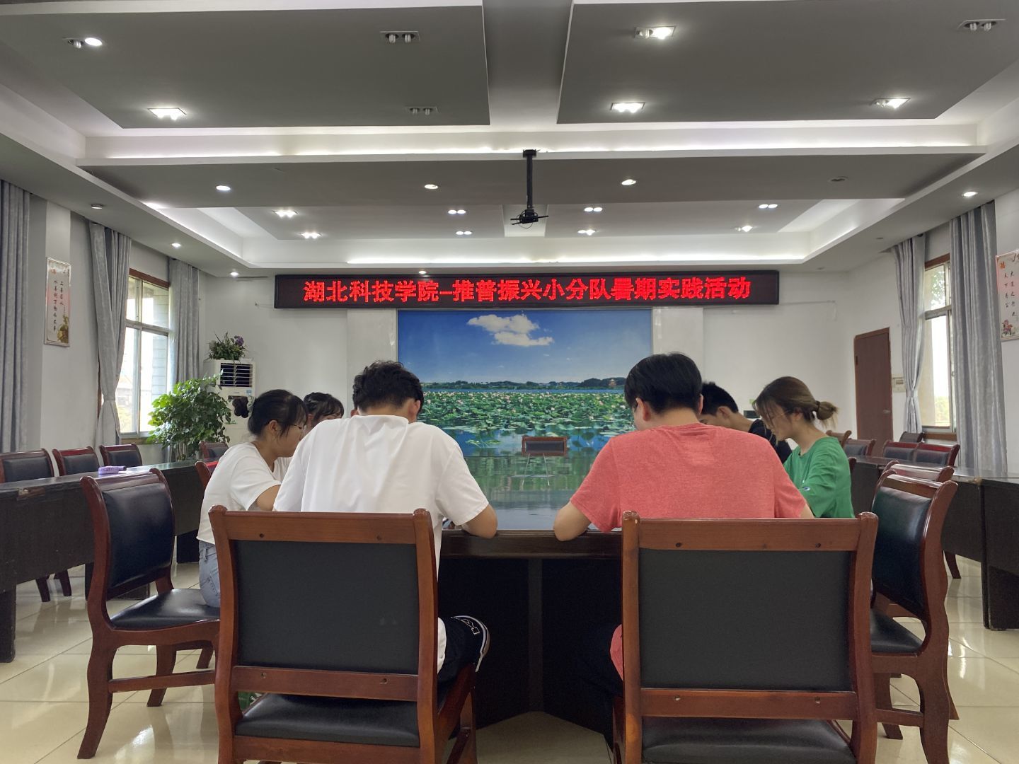 第二天与福田寺政府王主任具体商议,活动内容主要包含对当地虾稻种植模式,国民普通话普及程度等方面的了解调查。在指导老师的一步步引导下,我们渐渐明白了如何更好地推动推普发展助力乡村振兴的必要性和重要意义。