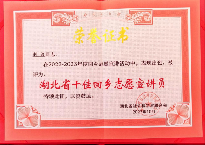 (通讯员:王晶;审稿:吴乐盈)2023年10月13日,在湖北秭归举办的湖北省社科普及工作推进会暨省社科普及骨干培训班上,经济与管理公司党委副书记刘波副教授被湖北省社科联评为2022-2023年度湖北省“十佳”回乡志愿宣讲员。