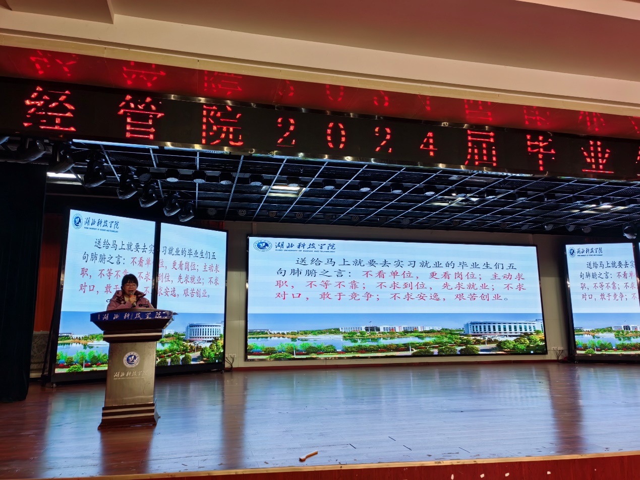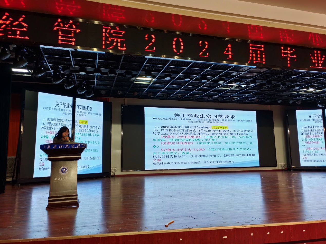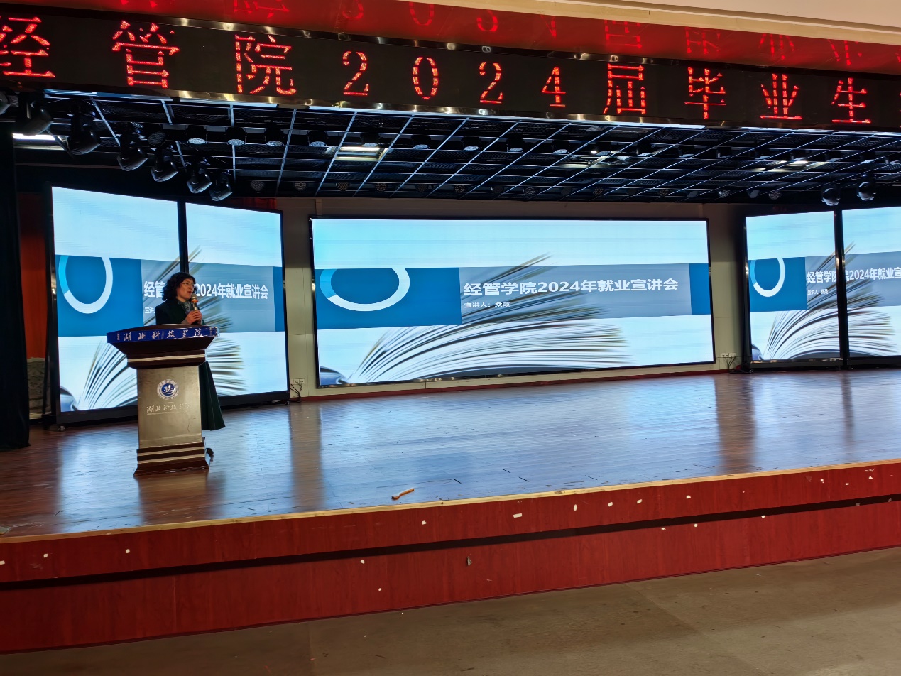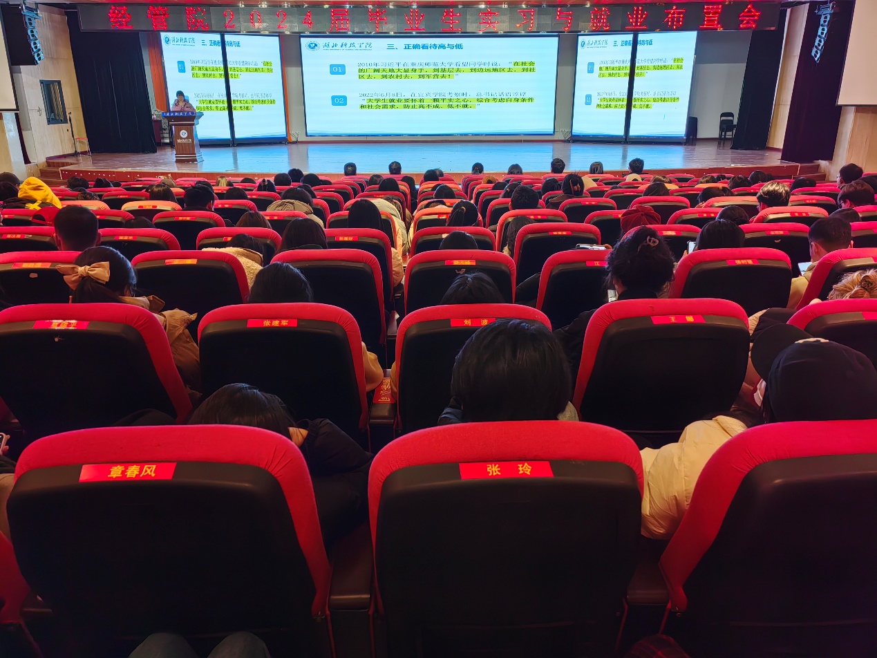 (通讯员:王晶 审稿人:刘波)为贯彻落实党中央、国务院对高校就业工作的决策部署,扎实推进公司就业指导与服务工作,坚持底线思维科学指引,主动适应新形势新要求,不断提高公司人才培养质量,进一步做好员工毕业就业工作,促进经管学子高质量充分就业。经济与管理公司于2024年1月1日晚,在图书馆学术报告厅组织2024届毕业生召开就业工作专题会,公司全体领导班子成员、 2024届班主任、辅导员和经管院2024届毕业生参加会议,特邀招商银行、长江证券、新华保险公司代表现场宣讲,会议由院党委副书记刘波主持。