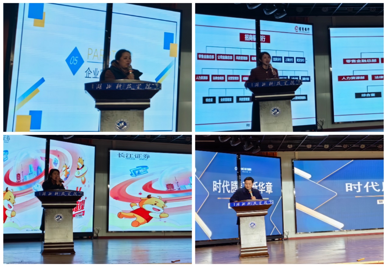 在企业宣讲会上,有来自招商银行武汉分中心、长江证券咸宁分公司和新华保险咸宁分公司的人事经理现场开展企业宣讲,他们详细介绍了公司文化、晋升通道、福利待遇等等具体情况,诚挚邀请我们的毕业生加入。作为特邀的优秀员工就业企业,新华保险咸宁分公司还特意介绍了本院17届员工朱程的成长经历。